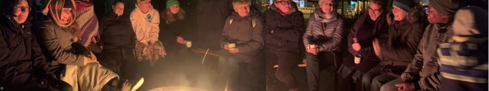 Etwa 20 Menschen sitzen um eine Feuerschale auf dem Parkplatz vor der Christuskirche. Es ist ein eiskalter Abend, der Feierabendverkehr schiebt sich durch die Nürnberger Südstadt und doch entsteht hier rund um das Feuer am wärmendem Lichtpunkt eine dichte Erzählatmosphäre: ein „Erzählraum“ bei dem für eine gute Stunde Menschen ihre Geschichten teilen: „Mein Leben in der Südstadt. Geschichten von Veränderungen“ lautete das Thema, das sich die einladende Gemeinde gemeinsam mit Thomas Amberg von BRÜCKE-KÖPRÜ, Sabine Arnold von der SinN-Stiftung und Esther Stüve vom forum Erwachsenenbildung gewählt hatten. Es ist einer von vielen anderen Erzählabenden, die die drei in diesen Wochen und Monaten hinaus aus den etablierten Räumen kirchlicher Bildungsarbeit in ganz verschiedene Stadtteile Nürnbergs bringen.